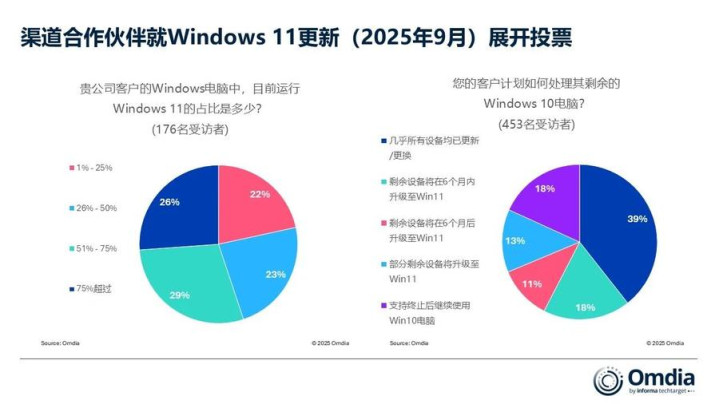 PC渠道合作伙伴的调查进一步揭示了过渡进程的挑战。在2025年9月对453名受访者的调研中,仅39%表示其客户基本完成PC的更新或升级。值得注意的是,18%的受访者称其客户计划在支持结束后继续使用Windows10,其中多数可能采用微软提供的扩展安全更新方案。这意味着微软、OEM厂商及渠道伙伴仍需投入大量资源,推动剩余用户群体的迁移工作。
